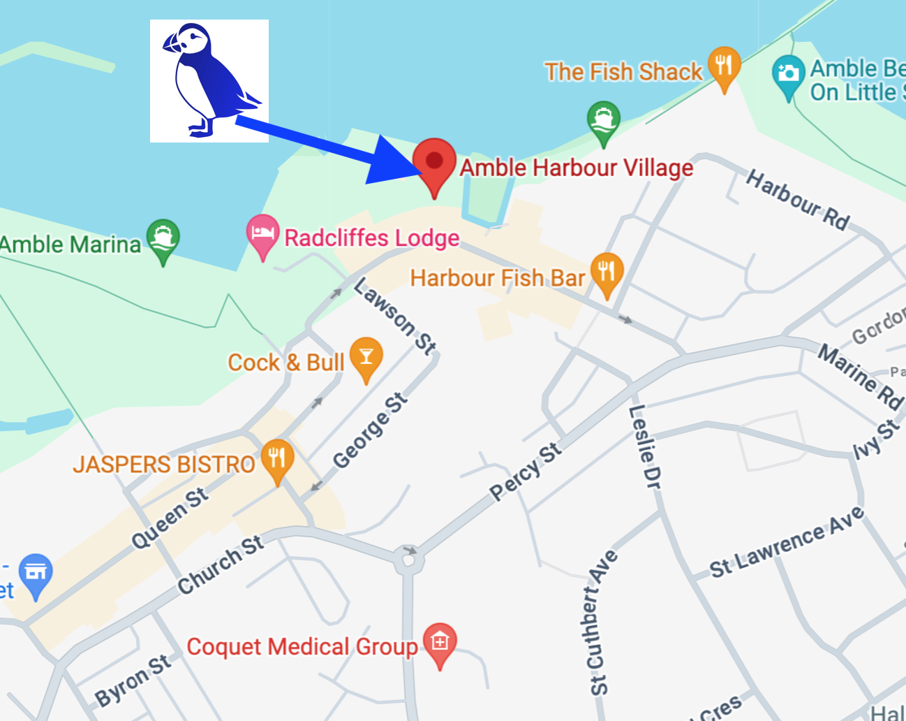 A: We are located in the Amble Harbour Village. Inside our Pod you will find a vast variety of Puffin Gifts, from Mugs, to Plates, Hats to Hoodies, We are sure you will find something to remember your trip with us.